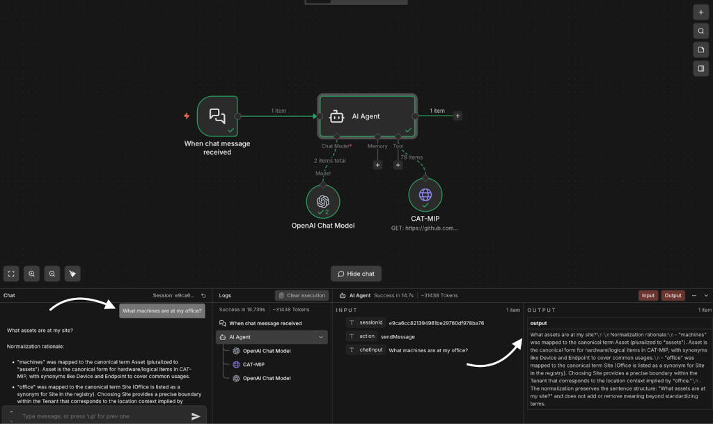 N8N is a workflow automation platform that allows you to build AI-driven agents using visual workflows. By integrating the CAT-MIP terminology registry into an N8N AI Agent, you can normalize user input before it is processed by downstream systems.