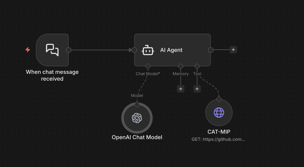 Copy and paste the following JSON snippet into your new workflow. It’s the JSON representation of a sample N8N AI Agent with CAT-MIPImportant: You must add your OpenAI API credentials to the OpenAI Chat Model node.